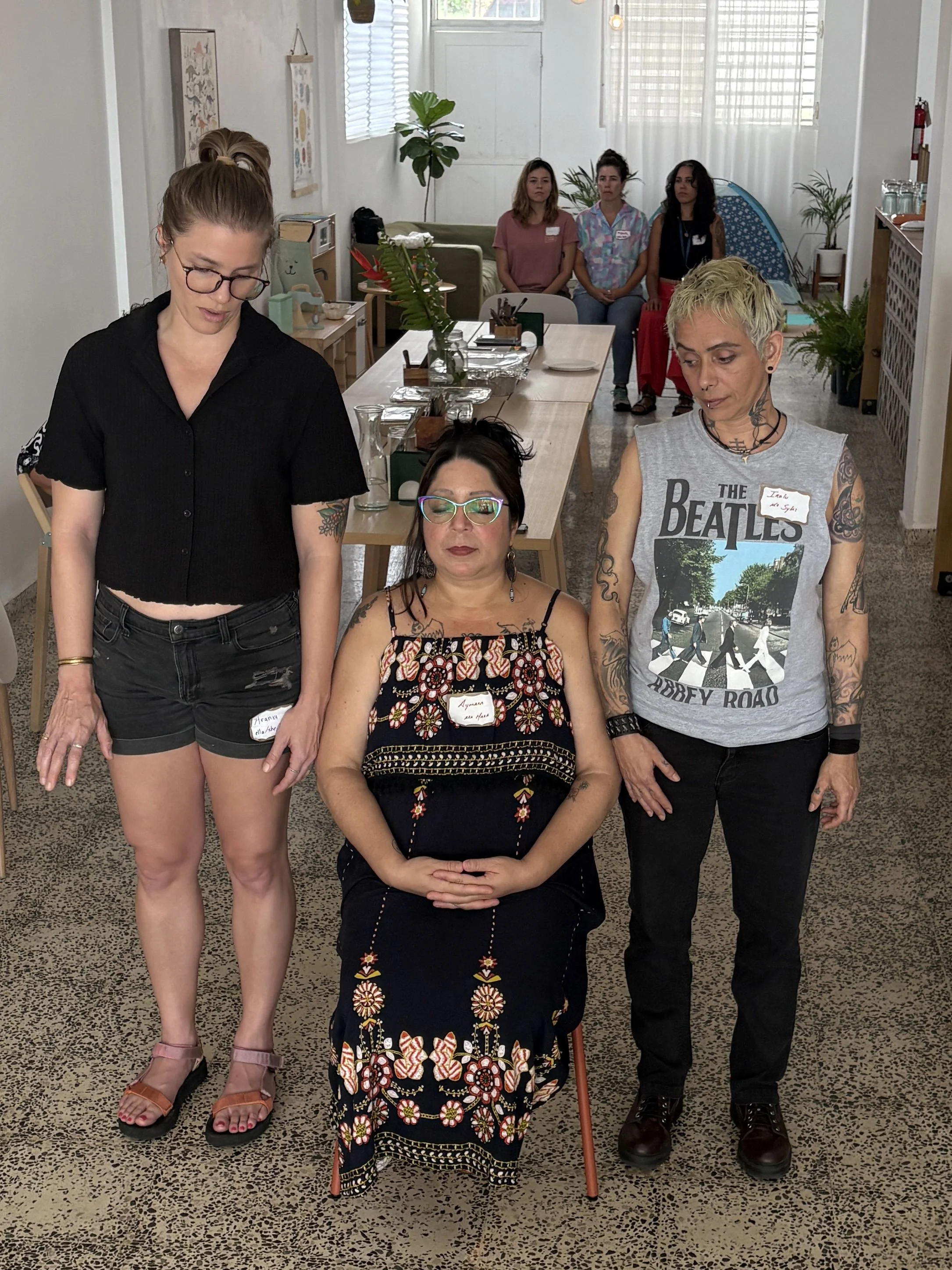 Image description: A photo of three people in the foreground standing shoulder to shoulder. The person in the middle is seated with their eyes closed. Behind them is another group of three people seated shoulder to shoulder. The participants pictured are in an allyship practice together and sharing affirmations of support.
